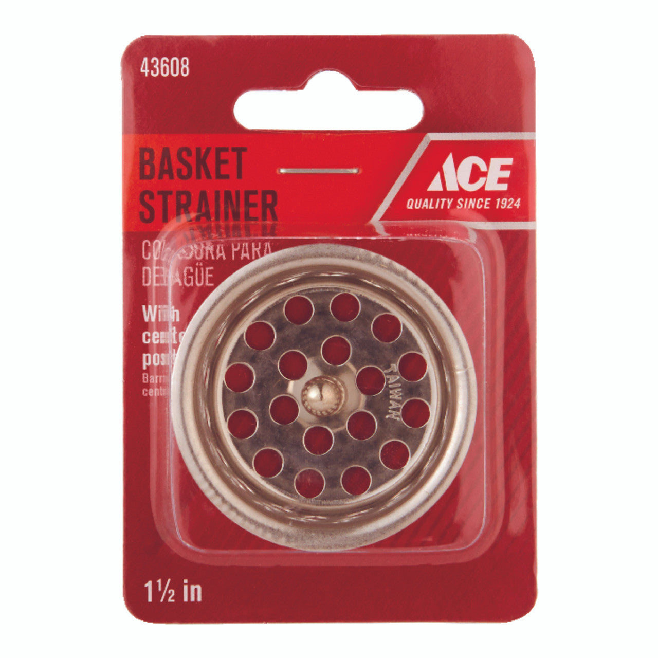 Brand Name: ACE | Diameter: 1 1/2 in. | Material: Stainless Steel | Material Finish: Chrome | Packaging Type: Carded | Rust Resistant: No Ace 1-1/2 in. diameter Crumb Cup - basket strainer has a chrome finish. Stop debris from clogging your sink with this strainer. | Basket strainer | With post | Chrome plated | Metal | Easy to install