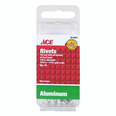 Brand Name: ACE | Color: Silver | Diameter: 1/8 in. | Material: Aluminum | Maximum Grip Range: 1/4 in. | Number in Package: 20 pk | Packaging Type: Clamshell Aluminum * 1/8 diameter * 3/16-1/4 grip * For use with all rivet tools * Package of 20 | Medium-strength aluminum can be used with aluminum and where rust is a potential problem | Reusable, full-visibility packaging simplifies product selection and storage