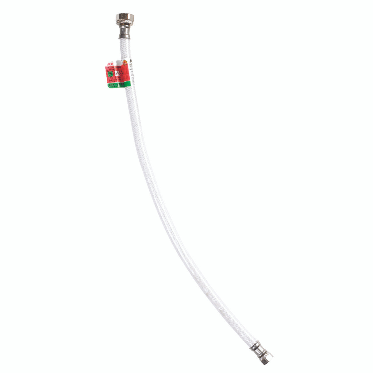 Application: Faucet | Average Lead Content: Less than 0.25 % | Brand Name: ACE | End 1 Connection: Compression | End 1 Diameter: 3/8 in. | End 2 Connection: IP | End 2 Diameter: 1/2 in. | Length: 20 in. | Material: PVC | Packaging Type: Bulk | Working Pressure: 125 psi Ace Hardware PVC faucet connector is durable and c | Constructed from reinforced PVC for strength | Hose designed to prevent kinking and crimping | For use in potable water distribution systems in accessible locations | Product complies with 0.25% weighted average lead content on wetted surfaces