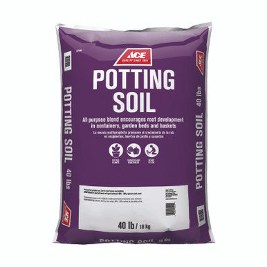 POTTING SOIL ACE 40# Brand Name: Ace Product Type: Potting Soil Package Size: 1 cu. ft. Packaging Type: Polybag All purpose for indoor and outdoor use Contains forest wood products, sands, compost bark and perlite Order this Ace no. for individual bags and Ace no. 7208713 Pallet Quantity = 60 Units in RSC: GA01, PA01, VA01, OH02, IL01, AZ01, WI01, CO01 Pallet Quantity = 65 Units in RSC: WA01, AL01, AR01, FL01, NY01, TX03, CA01 Discovery: Express,Convenience,Core,Super