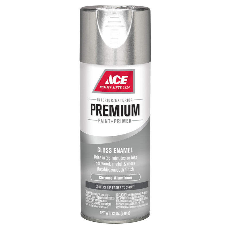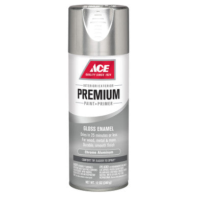 Brand Name: ace | Color: chrome-aluminium | Color Family: silver | Container Size: 12-oz. | Dry Time: 25-min | Inverted Spray Ability: no | Primer Required: no | Sheen: gloss | Sub Brand: premium | UV Resistant: no | Indoor or Outdoor: indoor-and-outdoor | Recommended Surface: metal/wood Dries in 25 minutes or less | For wood, metal & more | Durable, smooth finish