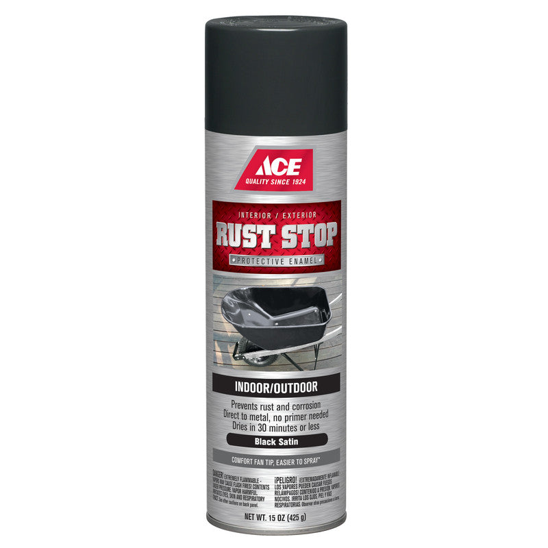 Brand Name: ace | Color: black | Color Family: black | Container Size: 15-oz. | Coverage Area: 35-sq.-ft. | Dry Time: 30-min | Inverted Spray Ability: no | Primer Required: no | Sheen: satin | Sub Brand: rust-stop | Time Before Recoating: 1-hr. | UV Resistant: yes | Clean Up: solvent | Indoor or Outdoor: indoor-and-outdoor | Recommended Surface: multi-purpose ACE Rust Stop Spray paint comes with a comfort fan tip that makes it easier to spray. | Prevents rust and corrosion - APWA safety colors | Direct to metal, no primer needed | Dries in 30 minutes or less