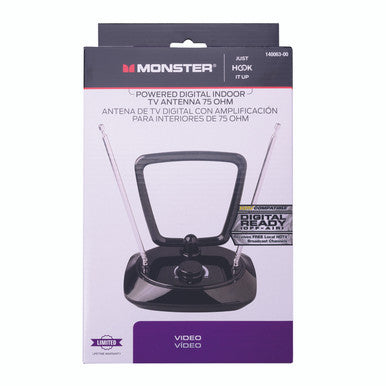 Amplified: Yes | Antenna Type: FM/HDTV/UHF/VHF | Brand Name: Monster Cable | Color: BLACK | Connector Type: Coax | Impedance: 75 Ohm | Mast Length: 54 in. | Number in Package: 1 pk | Packaging Type: Boxed | Sub Brand: Just Hook It Up | Indoor or Outdoor: Indoor Use this amplified digital indoor TV antenna for digital, high definition and standard video TV reception. | Amplified power for strong signal reception | Long 30 inch adjustable VHF dipoles for clear reception | Adjustable loop design for the best UHF reception | Adjustable gain to fine tune the best reception for digital and HDTV signals | Built-in high gain and low noise amplifier