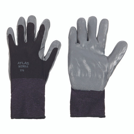 ANSI Certified: No | Brand Name: Atlas | Color: Black/Gray | Cut Resistant: No | Gender: UNISEX | Heat Resistant: No | Insulated: No | Knuckle Strap Protection: No | Leather Palm: No | Lined: No | Machine Washable: Yes | Material: Nitrile | Nonslip Grip: Yes | Number in Package: 1 pair | Packaging Type: Carded | Reinforced Palm: No | Safety Cuff: No | Size: L | Style: Dipped | Thumb Patch: No | Water Resistant: Yes | Indoor or Outdoor: Indoor/Outdoor | Breathable: Yes | Touchscreen Compatible: No This durable lightly coated flat-dipped dark gray colored Nitrile on black Nylon coated glove features exceptional touch sensitivity, grip, dexterity and durability with oil resistant Nitrile coating. The nylon lining provides extremely comfortable fit that is the lightest weight possible. An elastic knit-wrist secures the glove above the wrist for comfort and preventing debris from entering the glove. Launder using a neutral detergent. | Excellent dry grip | High flexibility and dexterity | Breathable, ventilated back | Designed for easy movement and continuous wear | Machine washable | Perfect for precise handling and general assembly, this nitrile palm coated, seamless knità ¢Ã¢â€š ¬Ã¢â€ž ¢s lightweight construction fits and feels, like second skin