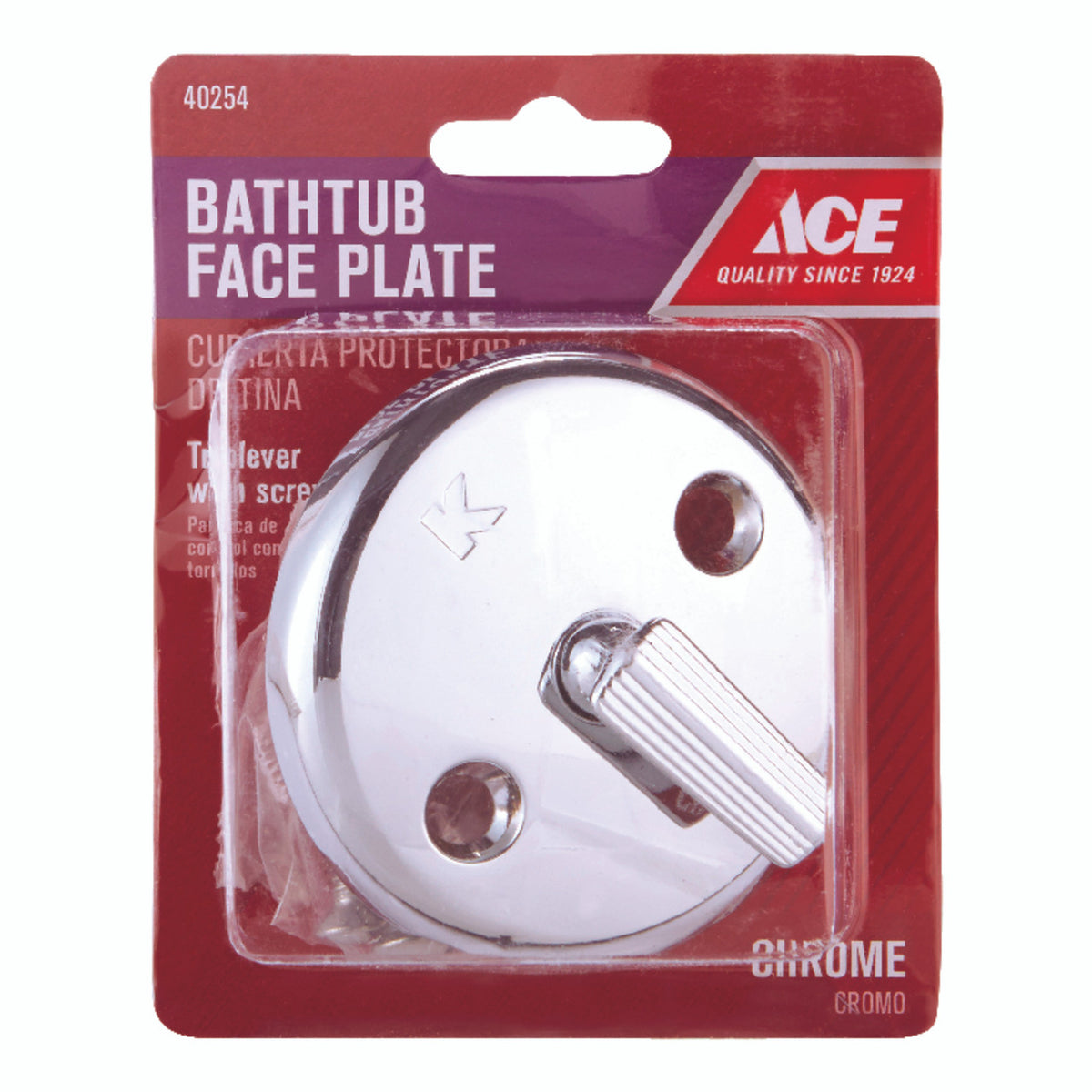 What's Included: Face plate and (2) screws | Brand Name: ACE | Connection Type: Threaded | Finish: Polished | Material: Chrome | Number of Pieces: 1 pc. | Packaging Type: Carded | Washers Included: No ACE826-1 is a Polished chrome triplever style tub overflow face plate with screws. | What's Included: Face plate and (2) screws | Controls tub overflow and waste | Polished Chrome | Trip lever style | Easy to Install