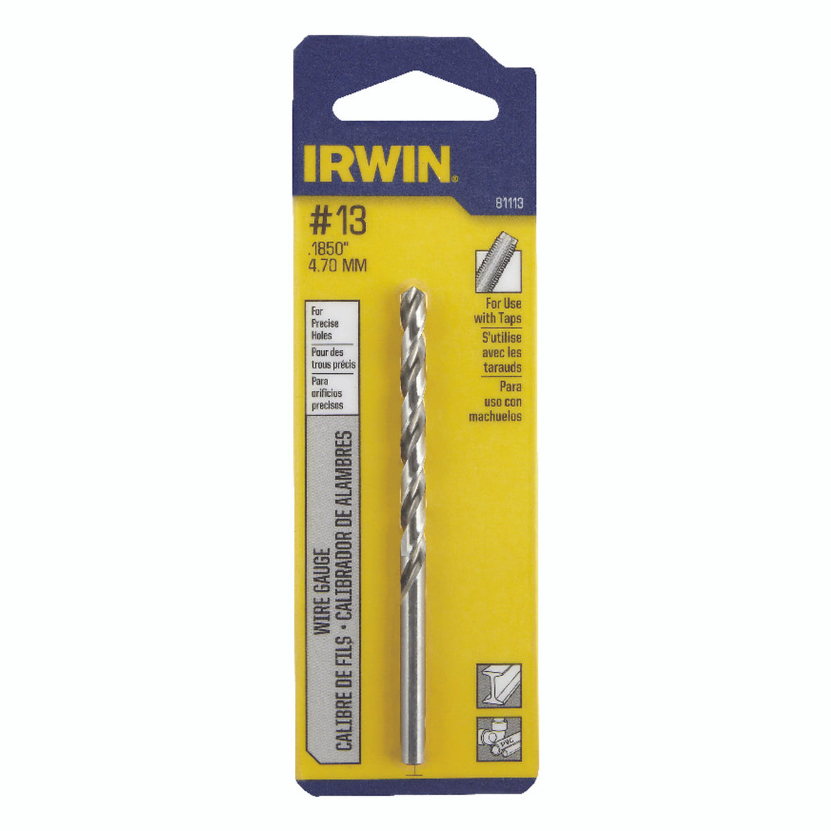 Brand Name: IRWIN | Finish: Bright | Material: High Speed Steel | Number in Package: 1 pc. | Overall Length: 3-1/2 in. | Packaging Type: Carded | Shank Type: Straight Shank | Usage: General Purpose | Flute Length: 2-5/16 in. | Drill Size: #13 The Irwin tools for basic drilling applications in | Drill bit no. 13 | 118 degree chisel point tip is perfect for general purpose applications | Engineered with premium high speed steel in bright finish | Straight shank | Automotive, maintenance and repair, portable drills, stationary drill press