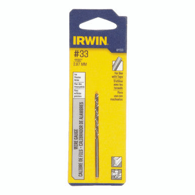 Brand Name: IRWIN | Finish: Bright | Material: High Speed Steel | Number in Package: 1 pc. | Overall Length: 2-5/8 in. | Packaging Type: Carded | Shank Type: Straight Shank | Usage: General Purpose | Flute Length: 1 1/2 in. | Drill Size: #33 The Irwin tools for basic drilling applications in | Drill bit no. 33 | 118 degree chisel point tip is perfect for general purpose applications | Engineered with premium high speed steel in bright finish | Straight shank | Automotive, maintenance and repair, portable drills, stationary drill press