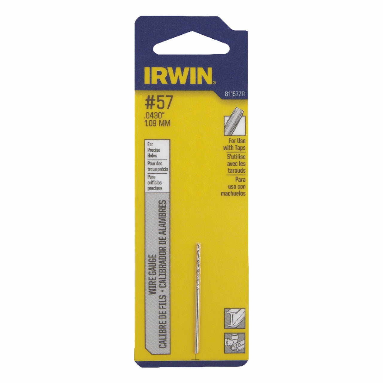 Brand Name: IRWIN | Finish: Bright | Material: High Speed Steel | Number in Package: 1 pc. | Overall Length: 1-3/4 in. | Packaging Type: Carded | Shank Type: Straight Shank | Usage: General Purpose | Flute Length: 3/4 in. | Drill Size: #57 The Irwin tools for basic drilling applications in | No. 57 wire drill bit | Engineered with premium high speed steel in bright finish | Ideal for use when non-fractional-sized holes are required | Straight shank | Automotive, maintenance and repair, portable drills, stationary drill press | Drills exact-sized hole for tapping applications