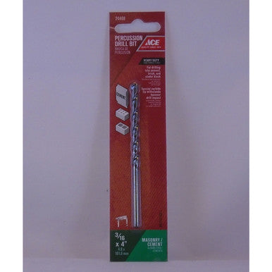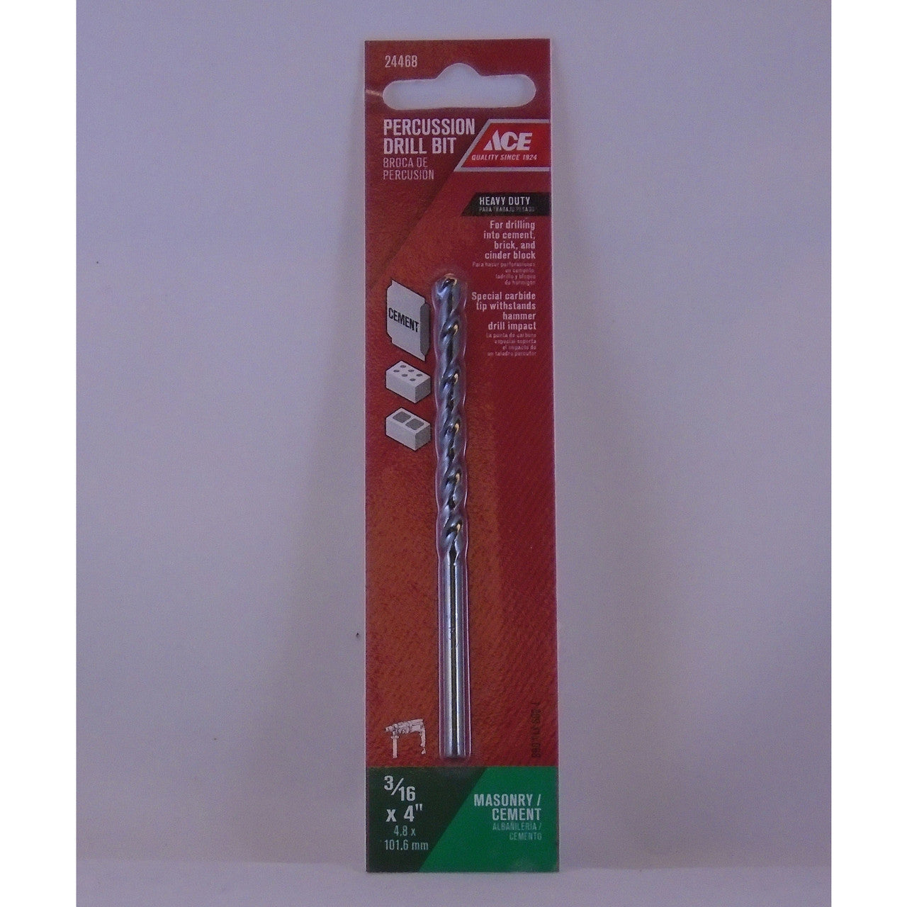 Brand Name: ACE | Material: STEEL | Number in Package: 1 pc. | Overall Length: 4 in. | Packaging Type: Carded | Shank Type: Straight Shank | Usage: Masonry and Cement | Drill Size: 3/16 in. Vermont American rotary hammer bits are used for drilling in concrete, stone, brick and cinder block. A specially formulated carbide tip withstands impact sustained from hammer drills. Available in a variety of sizes and sets. | Use rotary hammer bits for drilling in concrete, stone, brick and cinder block | A specially formulated carbide tip withstands impact sustained from hammer drills | For use in hammer drills with rotary and hammer settings