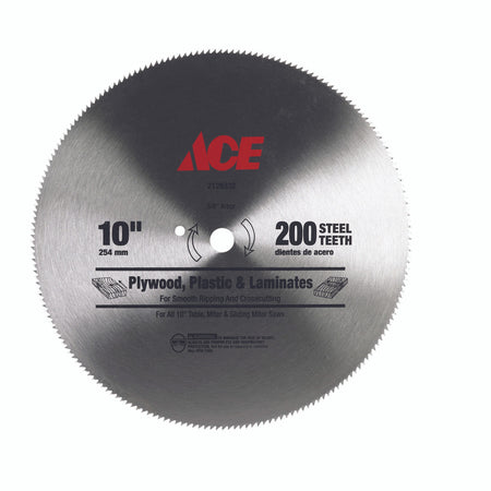 Arbor Size: 5/8 in. | Brand Name: ACE | Compatibility: Steel | Diameter: 10 in. | Material: STEEL | Maximum Speed: 7000 rpm | Number in Package: 1 pk | Number of Teeth: 200 teeth | Packaging Type: Carded | Usage: Fine Tooth Finish * * * Blade Diameter: 10 in. Number of Teeth: 200 teeth. Blade Material: Steel. Application: Fine Tooth Finish. Arbor Size: 5/8 in. Maximum Speed: 7000 rpm. * | Application: Fine Tooth Finish