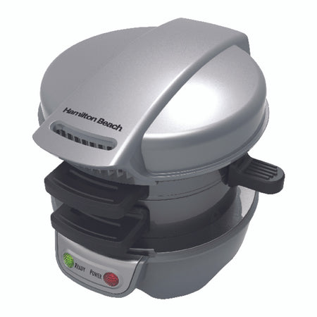 Brand Name: Hamilton Beach | Dishwasher Safe: Yes | Length: 5.6 in. | Material: Metal | Nonstick Surface: Yes | Watts: 120 watt | Width: 6.3 in. The Breakfast Sandwich Maker by Hamilton Beach comes to the rescue. Ità ¢Ã¢â€š ¬Ã¢â€ž ¢s all about making a fresh breakfast sandwich you can grab and go. Just choose your bread and layer on the fixings egg, cheese, precooked meat or the ingredients of your choice. In five minutes or less, your perfectly assembled breakfast sandwich is ready to eat. You can customize your breakfast sandwich with a practically endless variety of fresh ingredients. It lets you enjoy a homemade breakfast sandwich, made your way, in the comfort of your own kitchen. Cleanup is easy because all removable parts go in the dishwasher. | Ready in 5 minutes | Slide out the egg plate to finish your breakfast sandwich | Silver/Black | Ready light | 600 watts | Use your own fresh ingredients, including eggs, cheese, and much more | Quick and easy recipes included | Top plate - gently toasts the bread on top and holds the heat inside | Egg layer - Cooks a fresh egg perfectly, right inside your sandwich | First layer - Cooks the bottom half of your breakfast sandwich