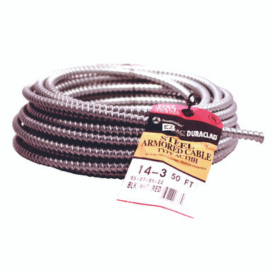 Amp Rating: 15 amps | Brand Name: Southwire | Cable or Wire Type: Steel Armored AC | Color: BLACK | Conductor Gauge: 14 Ga. | Conductor Material: Copper | Direct Burial: Yes | Flame Retardant: Yes | Ground Material: Steel | Insulation Material: PVC: Thermoplastic | Jacket Material: Steel | Number of Conductors: 3 | Stranded or Solid: Solid | Temperature Rating: 90 | UL Listed: Yes | Voltage Rating: 600 volt | Wet Location Use: No | Wire Length: 50 ft. | Gauge/Conductors: 14/3 | Indoor or Outdoor: Indoor AC 90 steel armored cable is black striped color coded. Flexible and efficient, no couplings or elbows needed. Copper conductors are THHN 90 degree Celsius rated. 16AWG internal bonding wire and the outer armor form the grounding path. Anti short bushings included. Permitted for branch circuits and feeders on both exposed and concealed work. Dry locations only. Due to the fluctuation of the copper market, reserves the right to bill at the prices prevailing on date of shipment. | Duraclad Ac Steel Armored Cable | Aluminum Cable | 600 Volts | For Dry Locations Only | For Branch, Feeder, Power, Lighting, Control | For Branch, Feeder, Power, Lighting, Control