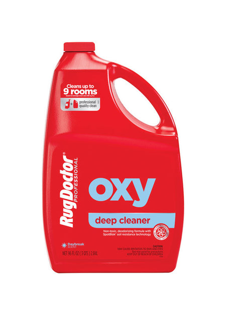 Brand Name: Rug Doctor | Concentrated: Yes | Container Size: 96 oz. | Product Form: Liquid | Scent: Daybreak | Sub Brand: Oxy Deep The Rug Doctor Oxy deep cleaner carpet solution is Scientifically engineered to deep clean carpets to perfection. The Oxy formula eliminates odors and lift stains by penetrating deep into carpet fibers and brings dirt and spots directly to the surface. The oxygen boosters produce professional quality results that leave carpets bright and fresh. This formula deep cleans every inch of soft surfaces from high-traffic carpets to a spot on the couch. Unlike other carpet solutions, the Rug Doctor Oxy deep cleaner solution will not leave a sticky residue after it dries. This formula is also safe and gentle enough to use around children, pets and won't damage your carpet fibers. For best results, use the Oxy deep cleaner carpet solution in any Rug Doctor rental cleaner or carpet cleaning machine. | Professional strength carpet cleaning solution that fights stained and soiled carpet with oxygen activated boosters, without leaving behind a sticky residue | The Daybreak scent serves as a carpet deodorizer and removes unbearable odors | Ideal for soft surfaces such as carpet, couches, furniture, rugs, chairs and auto upholstery