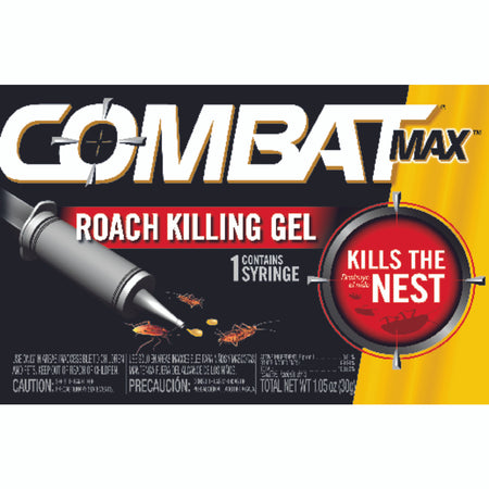 Active Ingredient: Fipronil | Brand Name: Combat | Container Size: 1.05 oz. | Packaging Type: Boxed | Pest Type: Roaches | Product Form: Gel | Sub Brand: MAX | Safe for Edibles: No | Safe for Pets: No | Indoor or Outdoor: Indoor and Outdoor Combat source kill max roach killing gel formula a | Kills insects at the source | Gel physical form | Application in cracks and crevices | Roaches pest type