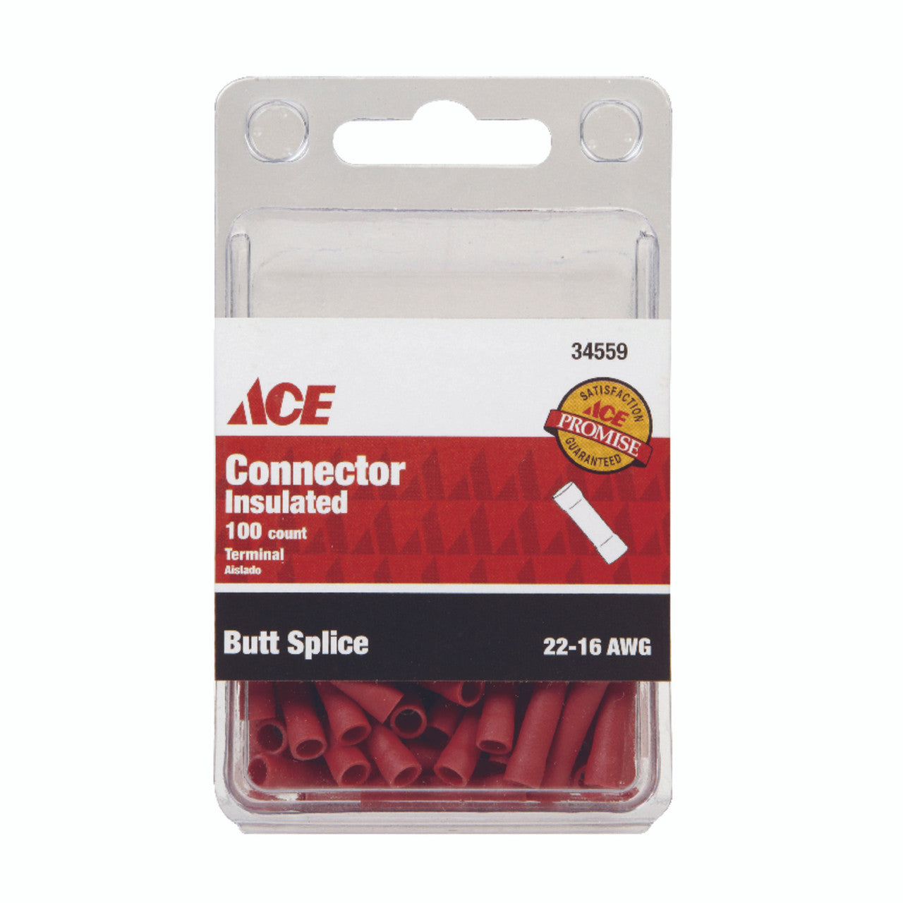 Brand Name: ACE | CSA LIsted: Yes | Color: Red | Number in Package: 100 pk | Packaging Type: Carded | UL Listed: Yes | Wire Range: 22-16 AWG | Wire type: Insulated Wire Connector Insulated | Butt Splice | 22-16 AWG | 100 Ct.