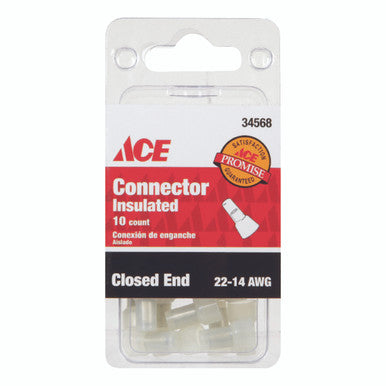 Brand Name: ACE | CSA LIsted: Yes | Color: CLEAR | Number in Package: 10 pk | Packaging Type: Carded | UL Listed: Yes | Wire type: Insulated Wire Ace Industrial 10 pk Nylon 22-14 AWG Clear Closed End Connector | Connector Insulated | Closed End | 22-14 AWG | 10 Ct.