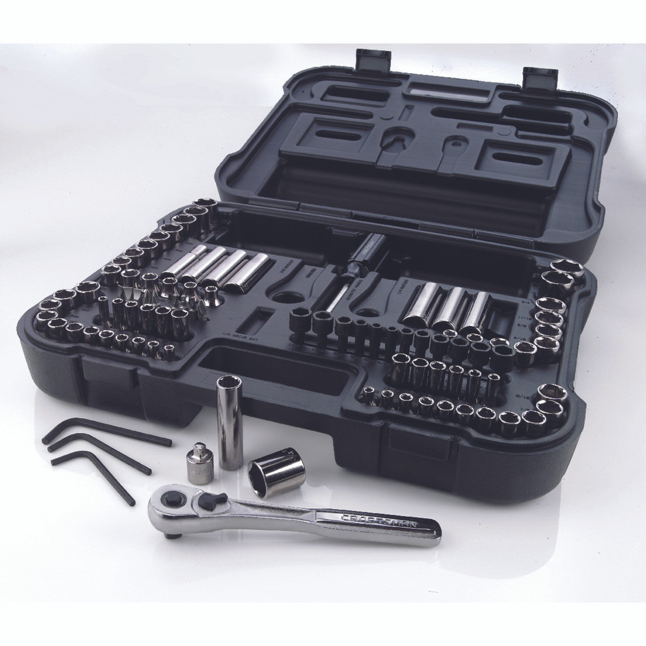 What's Included: 35 1/4 in. Drive 6 Point Sockets, 25 3/8 in. Drive 6 Point Sockets, 8 3/8 in. Drive 12 Point Deep Sockets, 3/8 in. Quick-Release Ratchet, 1/4 in. to 3/8 in. Socket Adapter, 21 pc. Screwdriver and Nutdriver Bits, 12 pc. Hex Key Set | Brand Name: cm | Drive Size: 1/4 and 3/8 in. drive | Material: STEEL | Metric or SAE: Metric and SAE | Number in Package: 104 pc. | Number of Points: 6 and 12 Point | Packaging Type: Boxed | Impact Rated: No Weà ¢Ã¢â€š ¬Ã¢â€ž ¢re cm, an authentic American icon. For nearly a century weà ¢Ã¢â€š ¬Ã¢â€ž ¢ve been the brand homeowners, home builders, auto enthusiasts and master mechanics trust. | What's Included: 35 1/4 in. Drive 6 Point Sockets, 25 3/8 in. Drive 6 Point Sockets, 8 3/8 in. Drive 12 Point Deep Sockets, 3/8 in. Quick-Release Ratchet, 1/4 in. to 3/8 in. Socket Adapter, 21 pc. Screwdriver and Nutdriver Bits, 12 pc. Hex Key Set | 21 piece screwdriver and nut driver bits | Quick release ratchet | Easy to use