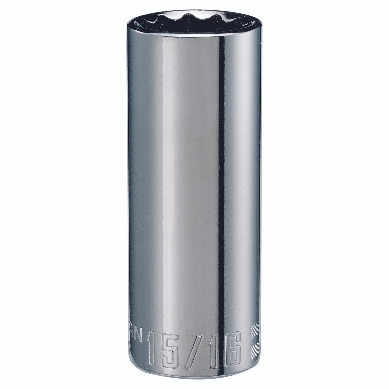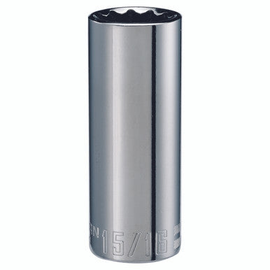 Brand Name: cm | Drive Size: 1/2 in. drive | Material: Alloy Steel | Metric or SAE: SAE | Number in Package: 1 pc. | Number of Points: 12 Point | Packaging Type: Carded | Socket Size: 15/16 in. | Style: Deep | Impact Rated: No Laser-etched size marking makes it easy to locate the right socket for the job. Great for working in low-lit or greasy environments. Permanent marking resists chipping, fading and corroding. 12 point configuration allows you to work in cramped areas where turning capacity is limited. | 1/2 in. size drive | 15/16 in. length | 12 point deep socket | Easy to read | Nickel plated finish