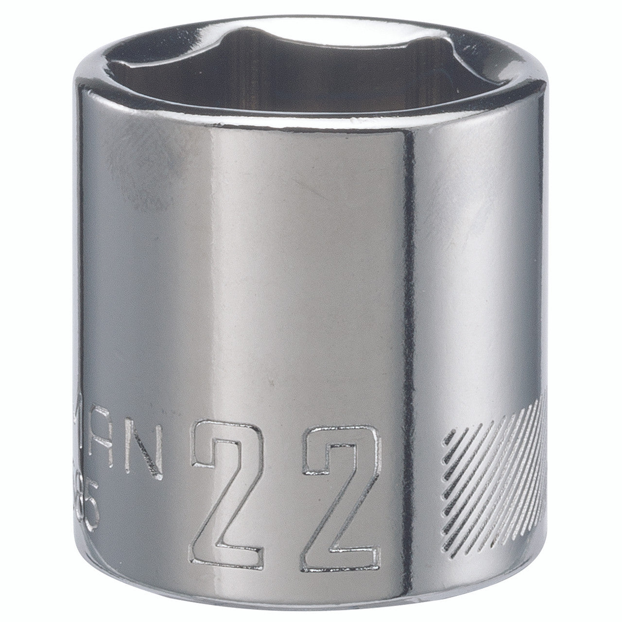 Brand Name: cm | Drive Size: 3/8 in. drive | Material: Alloy Steel | Metric or SAE: Metric | Number in Package: 1 pc. | Number of Points: 6 Point | Packaging Type: Carded | Socket Size: 22 mm | Style: Standard | Impact Rated: No The cm 22 mm socket, 6 point 3/8 inch drive sets the standard. This is an open stock socket that is part of a huge selection of both standard and metric tools and accessories available at Sears. This inexpensive but powerful cm 22 mm Socket, 6 point makes a great stocking stuffer and also makes a great birthday gift or Valentines day gift for people who are starting a tool collection or who are filling in the missing sockets they need to create a full set. | Features easy to read markings that make the socket easier to use in environments with low light | Has a 3/8 in. drive, metric measurements and six contact points | Made of alloy steel | 22 mm socket size