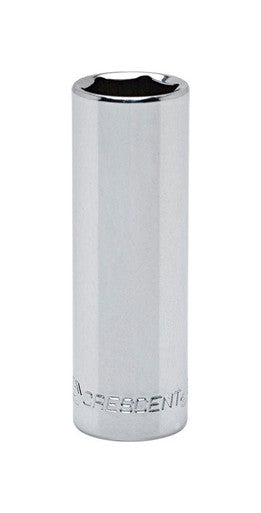 Brand Name: Crescent | Drive Size: 3/8 in. drive | Length: 1.69 in. | Material: Chrome Vanadium Alloy Steel | Metric or SAE: SAE | Number in Package: 1 pc. | Number of Points: 6 Point | Packaging Type: Carded | Socket Size: 3/8 in. | Style: Deep | Impact Rated: No 3/8 inch drive, 3/8 inch deep socket, 6 point chrome vanadium alloy steel for long lasting durability nickel chrome plated for long lasting protection Surface Drive technology reduces fastener rounding. | Nickel Chrome plated for long lasting protection | Chrome Vanadium Steel | Mirror polish finish | Sockets feature Surface Drive technology to virtually eliminate fastener rounding | Deep well | 6 Point | 3/8 in. Drive | 3/8 in. | Crescent Quality tools get jobs done faster and increase overall productivity. Crescent mechanics tools are made from chrome vanadium steel alloy, specially formulated and heat-treated for high strength and superior resistance to abrasion and corrosi