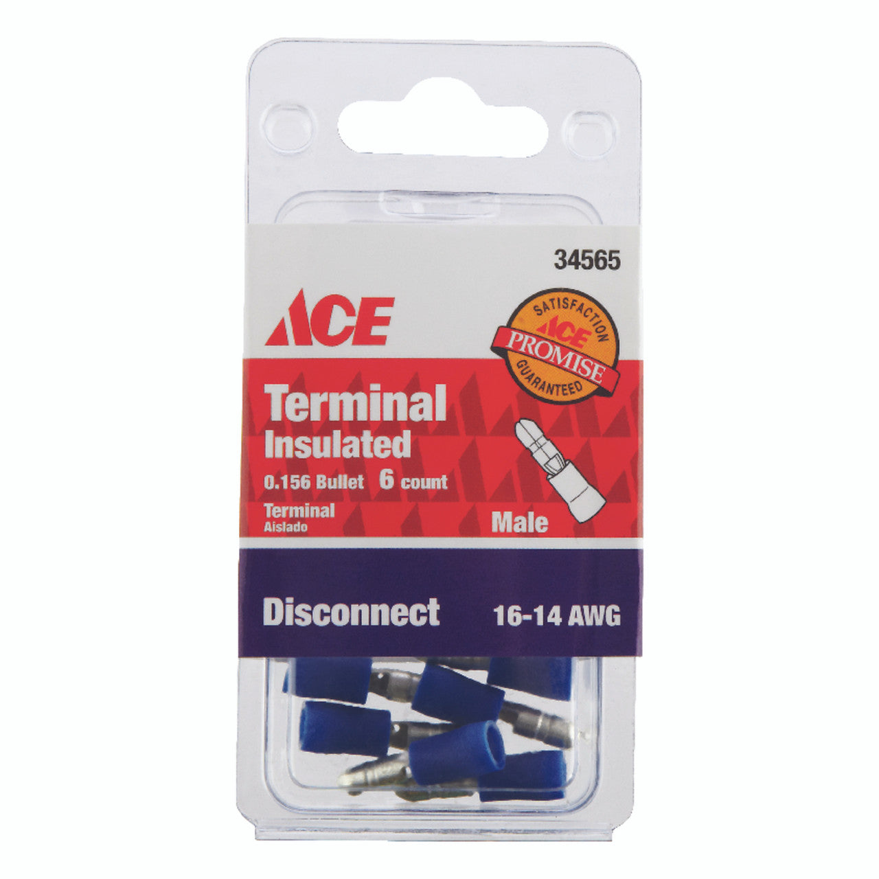Brand Name: ACE | CSA LIsted: Yes | Color: Blue | Number in Package: 6 pk | Packaging Type: Carded | UL Listed: Yes | Wire Range: 16-14 AWG | Wire type: Insulated Wire Terminal Insulated | Disconnect | .156 Bullet | Male | 16-14 AWG | 6 Ct