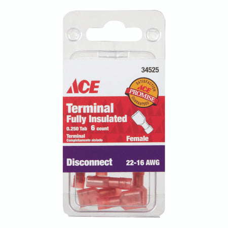 Brand Name: ACE | CSA LIsted: Yes | Color: Red | Number in Package: 6 pk | Packaging Type: Carded | Terminal Type: Fully insulated | UL Listed: Yes | Wire Range: 22-16 AWG | Wire type: Insulated Wire Terminal Fully Insulated | Disconnect | 22-16 AWG | .250 Tab | Female | 6 Ct.