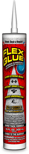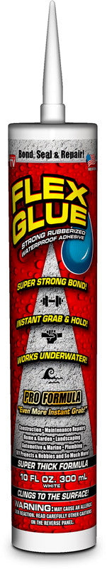 Application: Can be applied to almost any surface | Brand Name: Flex Glue | Coating Material: Rubberized Waterproof Adhesive | Color: WHITE | Color Family: White | Container Size: 10 oz. | Coverage Area: 50 sq. ft. | Dry Time: 48 hr. | Indoor and Outdoor: Indoor and Outdoor | Inverted Spray Ability: No | Packaging Type: Cartridge | Primer Required: No | Time Before Recoating: 24 hr. | UV Resistant: Yes | Indoor or Outdoor: Indoor and Outdoor | Full Cure Time: 48 hr. | Recommended Surface: Most Surfaces Flex Glue's Pro Formula comes in a 10 oz cartridge and has even more instant grab. Flex Glue is an easy to use, super strong, rubberized, waterproof adhesive that instantly bonds, seals and repairs virtually everything. It's super thick adhesive clings to the surface and can be used on dry or wet surfaces. It's amazing instant grab holds objects in place and in most cases eliminates the need for braces. It cures in 24-48 hours and reaches maximum strength in 7 days. This glue is mildew and UV resistant, paintable, solvent free, VOC compliant, low odor and will not shrink or crack. It won't run or drip and can easily be applied to vertical and overhead surfaces. Excellent for: All types of metal, wood, foam, rubber, tile, ceramic, marble, porcelain, glass, granite, brick, concrete, stucco, plaster, stone, masonry, drywall, sheet rock, fiberglass, some plastics and vinyl's, composites, PVC, EPS, EPDM roofs and so much more. | Super strong, rubberized, waterproof adhesive. | Surfaces: Metals, Wood, Foam, Rubber, Tile, Ceramic, Marble, Porcelain, Glass, Granite, Brick, Concrete, Stucco, Plaster, Stone, Masonry, Drywall, Sheetrock, Fiberglass, Some plastics & vinylà ¢Ã¢â€š ¬Ã¢â€ž ¢s, composites, PVC, EPS, EPDM roofs and so much more! | Super thick. No run or drip during application. Can be applied to overhead surfaces. | Can be used on dry or wet surfacesà ¢Ã¢â€š ¬ ¦ and even underwater! | Strong instant grab adhesive that works like a magnet, locks into place and holds on tight. | Mold, Mildew, UV and weathering resistant. | Remains flexible | VOC compliant, Low odor adhesive and Solvent-free and Paintable. | A standard caulking gun is required (not included). | Now, any project big or small, with Flex Glue you can do them all!