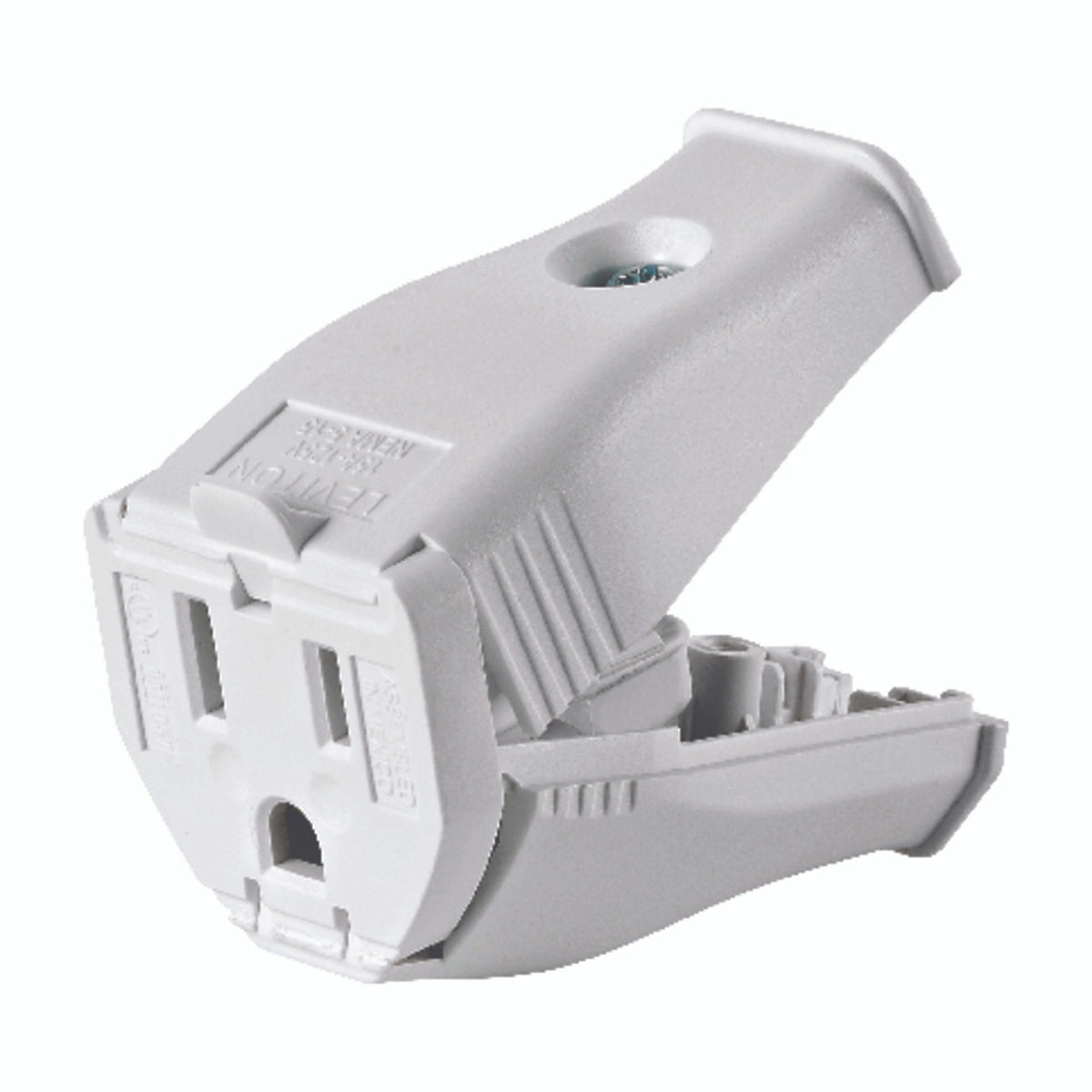 Brand Name: Leviton | CSA LIsted: Yes | Color: WHITE | Grade: Commercial and Residential | Grounded: Yes | Material: Thermoplastic | Maximum Amperage: 15 amps | Nema Type: 5-15R | Number in Package: 1 pk | Number of Poles: 2 | Number of Wires: 3 | Packaging Type: Bulk | Plug Type: Straight Blade | Poles Wires: 2 Pole 3 Wire | UL Listed: Yes | Volts: 125 volt The Leviton line of residential plugs and connectors has been expanded with the addition of a grounding model available in four colors black, gray, orange and white and the best-selling 515 PV and CV in orange. Leviton plugs and connectors are rugged, easy to wire and feature brass plug blades and connector contacts for maximum conductivity. | 15A-125V | Vinyl Hinged Connector | 2-Pole, 3-Wire