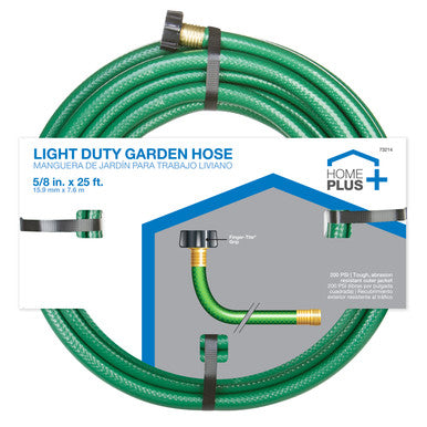Brand Name: Home Plus | Burst Pressure: 200 psi | Color: Green | Crush Resistant: Yes | Diameter: 5/8 in. | Fitting Coupling Material: Brass | Grade: Light Duty | Hot Water Use: No | Kink Resistant: Yes | Length: 25 ft. | Material: Vinyl | Reel Included: No 5/8 x 25' Swan Light Duty Home Plus. Designed for the typical backyard enthusiast, This water hose is a lightweight garden hose for low-water-pressure needs. Its light weight coupled with low PSI make it the best garden hose for accomplishing light-duty gardening tasks with the least amount of effort, such as watering delicate plants and rinsing off garden tools. This low-water-pressure garden hose is also a great water-saving hose, making it both economical and environmentally friendly. Three-ply construction with nylon reinforcement supports burst-resistance, while a scuff-resistant jacket helps prevent this light-duty garden hose from wearing away. It also makes cleaning this garden hose for low pressure easy. | 200 PSI burst strength | Light-duty garden hose for low-pressure needs such as watering delicate plants | Maintains pressure at reduced flow rate to conserve water | Abrasion-resistant jacket is easy to clean and helps prevent wear and tear | High-impact plastic female coupling easily attaches to all standard faucets and most water accessories | Economical and environmentally friendly | Made in the USA with global components
