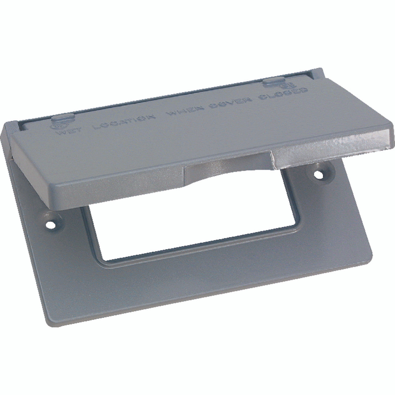 What's Included: Cover, hardware and gasket | Application: Wet Locations | Brand Name: Sigma Electric | Color: Gray | Height: 2.83 in. | Material: Metal | Number of Gangs: 1 gang | Packaging Type: Shrinkwrapped | Shape: Rectangle | UL Listed: Yes | Width: 4.57 in. Sigma's weatherproof one-gang GFCI covers provide protection to outdoor horizontal GFCI receptacles. Their rugged, die-cast construction features a self-closing lid which prevents moisture penetration when receptacles are not in use and compliment weatherproof one-gang boxes. GFCI covers are powder coated for corrosion resistance and include hardware and gasket. | What's Included: Cover, hardware and gasket | Provides weatherproof protection for 1-gang outdoor applications | Compliments a horizontally installed GFCI receptacle and box in a wet, damp or dry location | Features a self-closing lid to prevent moisture penetration when receptacle is not in use | Die-cast construction and powder coated for corrosion resistance | Product is UL and CSA listed and suitable for wet locations when the covers are closed | Includes hardware and gasket