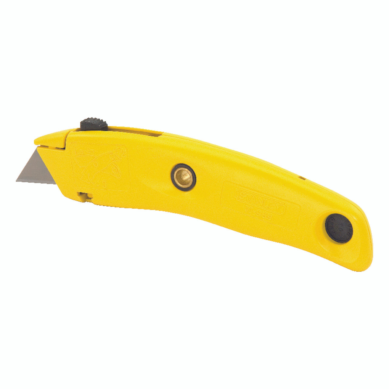 Blade Storage: No | Blade Type: Knife Blade | Brand Name: Stanley | Color: Yellow | Handle Length: 7 in. | Lockable Blade: Yes | Number in Package: 1 pc. | Number of Blades Included: 3 blade | Packaging Type: Carded | Retractable Blade: Yes | Sub Brand: Swivel-Lock | Opening Style: Retractable The Stanley Swivel Lock Retractable Utility Knife features an interlocking nose to secure the blade safely between knife halves and has a comfortable handle for extended use and swivels open for quick easy blade change. | Body swivels open for quick and easy blade change | Durable aluminum body stores extra blades | Contoured handle designed to fit your hand | Interlocking nose secures together knife halves for safety