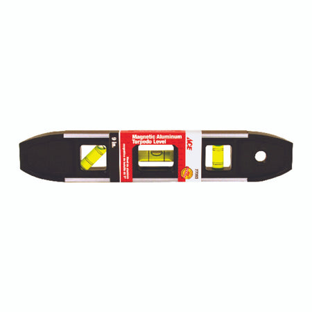 Brand Name: ACE | Color: Orange | Height: 9 in. | Length: 9 in. | Level Type: Shock-Resistant Torpedo | Material: Aluminum | Number in Package: 1 pc. | Number of Vials: 3 vial | Weight: 0.22 lb. Find plumb, level and 45 ° quickly and easily with Johnson's 9 magnetic torpedo level. It features a reinforced aluminum frame and high impact panels for durability and a top-read window for easy viewing. Its rubber magnetic edge allows for convenient hands-free use on ferrous metal surfaces, while the V-groove frame fits on pipe and conduit. | Full length strong magnetic edge | Reinforced aluminum frame | V-groove frame fits on pipe and conduit | Top-read window for easy viewing