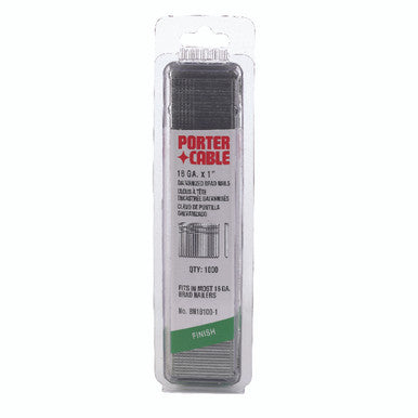 Brand Name: Porter Cable | Fastener Type: Straight Strip | Finish: Galvanized | Gauge: 18 Ga. | Length: 1 in. | Material: STEEL | Number in Package: 1,000 box | Packaging Type: Boxed | Head: Round | Shank: Smooth Shank | Collation: Glue | Point: Chisel Point Porter-Cable factory service provides fast, professional tool repair when you need it. Our service network is unmatched in the industry so you can have absolute confidence knowing that you and the job will not be let down. | These nails are designed to be used in 18 gauge fasteners | Brad nails are great for applications where a less visible nail is needed and which do not require structural strength, such as applying decorative moldings to projects | Ideal for fastening case corners, drawers, cabinets, picture frames, molding and decorative trim | Suitable for indoor use
