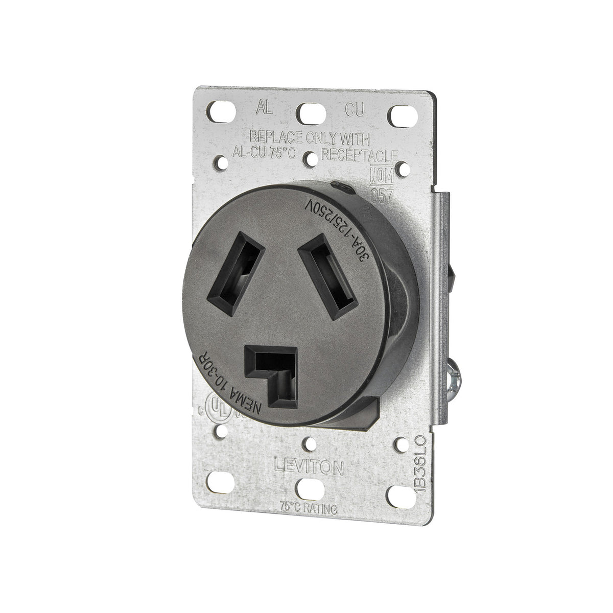 Brand Name: Leviton | CSA LIsted: Yes | Color: BLACK | Commercial or Residential: Commercial and Residential | Depth: 1.61 in. | Gauge: 4-8 Ga. | Grounded: No | Height: 3.75 in. | Material: Thermoplastic | Maximum Amperage: 30 amps | Nema Type: 10-30R | Number in Package: 1 pk | Number of Poles: 3 | Number of Wires: 3 | Packaging Type: Bagged | UL Listed: Yes | Volts: 125/250 volt | Width: 2.42 in. | Indoor or Outdoor: Indoor | Outlet Configuration: Duplex Built of durable thermoplastic, Leviton Power Receptacles come equipped with heavy-gauge, double-wire copper alloy contacts. To ensure correct and speedy wiring, terminals have ID markings. Flush mount receptacles fit Levitonà ¢Ã¢â€š ¬Ã¢â€ž ¢s wide range of 2.15 inch diameter wallplates and mounting hardware is included. | Flush mount | Side wired | Steel strap material