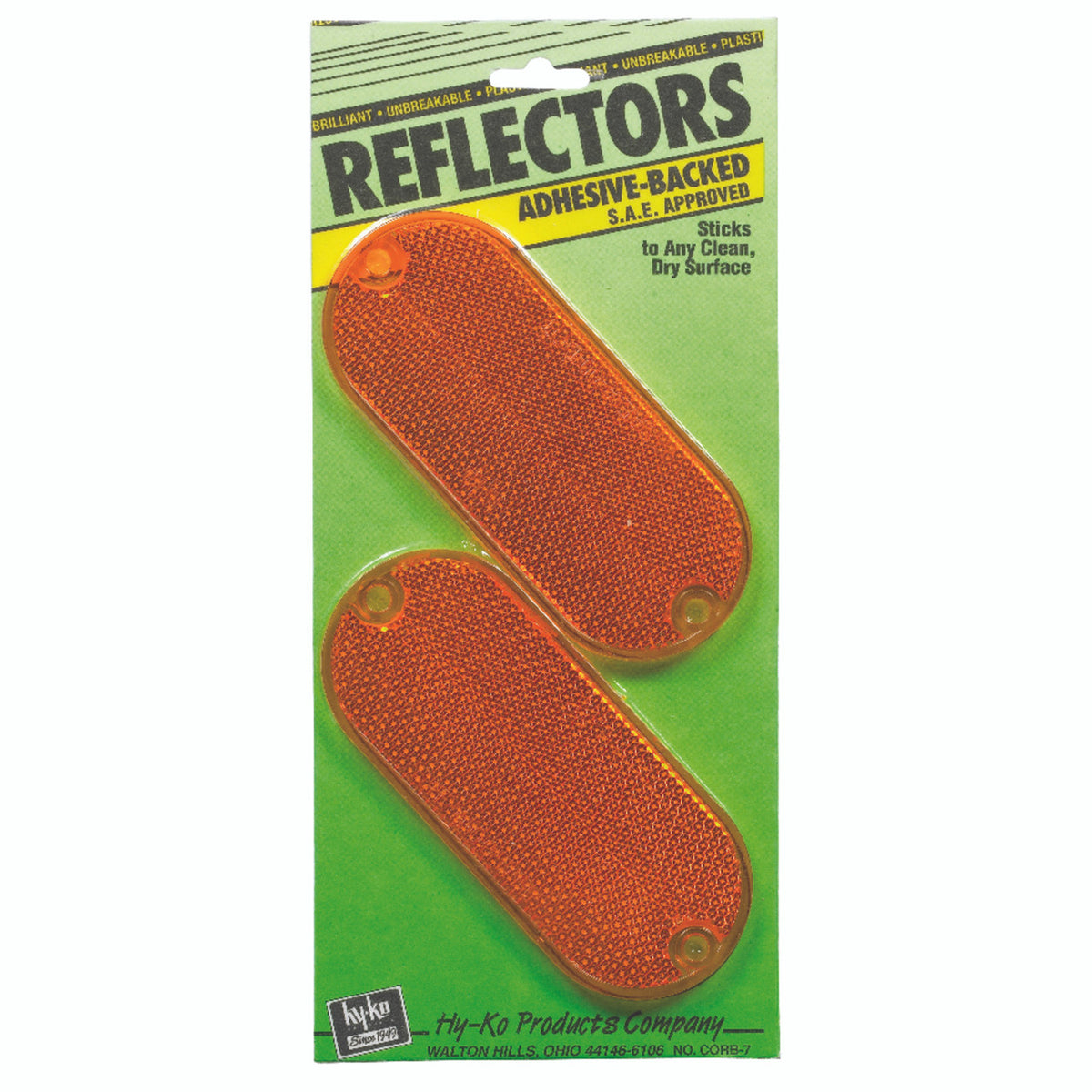 Brand Name: HY-KO | Color: Amber | Height: 4.38 in. | Material: Plexiglass | Number in Package: 2 pk | Packaging Type: Carded | Rod Diameter: 4-3/8 in. | Shape: Round Made of break-resistant Plexiglas * skin packed on attractive cards * display on pegboard or display rack * self- adhesive * | 4 3/8 inch oval shape reflector | Amber color | Self adhesive | Plexiglas