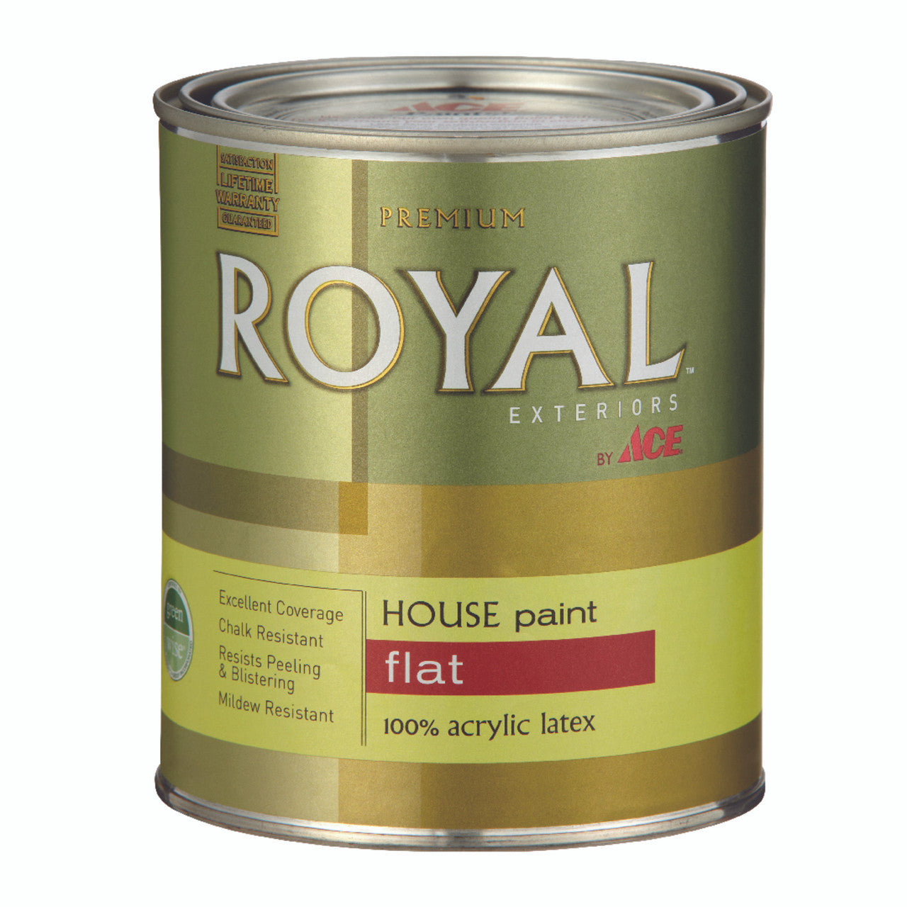 Brand Name: ace | Coating Material: acrylic-latex | Color: white | Color Family: white | Container Size: 1-qt. | Coverage Area: 100-sq.-ft. | Durability: 25 | Sheen: flat | Sub Brand: royal | Time Before Recoating: 4-hr. | Tintable: no | UV Resistant: yes | VOC Level: 50-g/l | Clean Up: soap-and-water | Full Cure Time: 1-week This high quality 100% acrylic latex paint provides a long-lasting superior finish for exterior surfaces. This rich, creamy formulation assures all the convenience of latex paint and primer as well as exceptional durability. | 100% Acrylic Paint and Primer | Excellent Coverage | Chalk & Mildew Resistant | Resists Peeling & Blistering