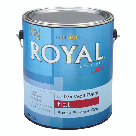 Base Type: Midtone Hi-Hide Base | Brand Name: ACE | Coating Material: Vinyl Acetate/Ethylene | Color Family: White | Container Size: 1 gal. | Coverage Area: 250-400 sq. ft. | Mildew Resistant Finish: No | Sheen: Flat | Sub Brand: Royal | Time Before Recoating: 4 hr. | Tintable: Yes | UV Resistant: No | VOC Level: Low VOC | Water Resistant: No | Clean Up: Water and Soap | Indoor or Outdoor: Indoor | Full Cure Time: 24 | Recommended Surface: Excellent for hard use areas such as childrens roo Excellent for hard use areas such as childrens rooms, kitchens, bathrooms and laundry rooms. Ideal for all interior walls and woodwork including living rooms, dining rooms and halls. Use on properly prepared plaster, wallboard, wood and masonry. | Excellent Coverage | Long Lasting Durability | Scrubbable