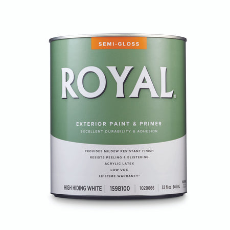Brand Name: Royal | Coating Material: Acrylic Latex | Color: High Hiding White | Container Size: 1 qt. | Coverage Area: 82-106 sq. ft. | Durability: Limited Lifetime Warranty | Sheen: Semi-Gloss | Time Before Recoating: 4 hr. | Tintable: No | UV Resistant: No | VOC Level: 45 g/L | Clean Up: Soap and Water | Indoor or Outdoor: Outdoor | Full Cure Time: 14 day | Contents Before Colorant: 32 oz. Royal Exterior paint is a trusted classic, perfect for everyday updates. Formulated with excellent adhesion and durability, provides weathering protection and a mildew resistant finish for a variety of exterior surfaces. Paint & primer together reduces steps and saves time. | Semi-Gloss is a moderately shiny finish formulated with excellent adhesion and durability. | Provides weathering projection and mildew resistant finish for a variety of exterior surfaces. | Use on all properly prepared exterior wood, brick, masonry, stucco, factory primed hardboard, vinyl or aluminum siding, cement cinder block and primed metal surfaces.