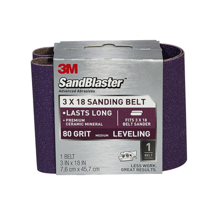 Brand Name: 3M | Grade: Medium | Grit: 80 Grit | Length: 18 in. | Material: Ceramic | Number in Package: 1 pk | Sub Brand: SandBlaster | Usage: Multi Surface | Width: 3 in. 3M Premium sanding Belts are ideal for use on many surfaces. Premium power tool abrasives were designed especially for high speed power tool sanding. This sanding belt was specially developed for coarse sanding, leveling or stripping. The heavy duty cloth backing is coated with extremely durable Cubitron mineral, which stays sharp resulting in less surface burning, a more consistent sanded surface and a longer life, when compared to 3M's conventional Belts. | Custom made for power tools | Less work and stays sharp | Lasts longer | Smooth running bi-directional splice reduces bumping | Clog-resistant | Premium cubitron ceramic mineral | Ideal for use on wood, metal and fiberglass