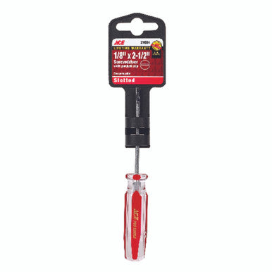 Brand Name: ACE | Color: Red | Drive Size: 1/8 in. | Drive Type: Slotted | Handle Material: Plastic | Hardened: Yes | Magnetic Tip: No | Number in Package: 1 pc. | Overall Length: 5.04 in. | Packaging Type: Clamshell | Ratcheting: No | Shaft Length: 2-1/2 in. | Shaft Material: Steel | Shaft Type: Round | Drive Type: Slotted The clear, chemical-resistant handle provides a comfortable grip while allowing for just the right amount of torque. The easy-grip handle makes it simple to maintain hand-positioning for multiple turns. | The acetate handle is made to be chemical resistant for longer wear and designed to offer you a secure grip | SVcm steel optimizes toughness, hardness, and durability | Blade features a chrome finish that offers protection against corrosion