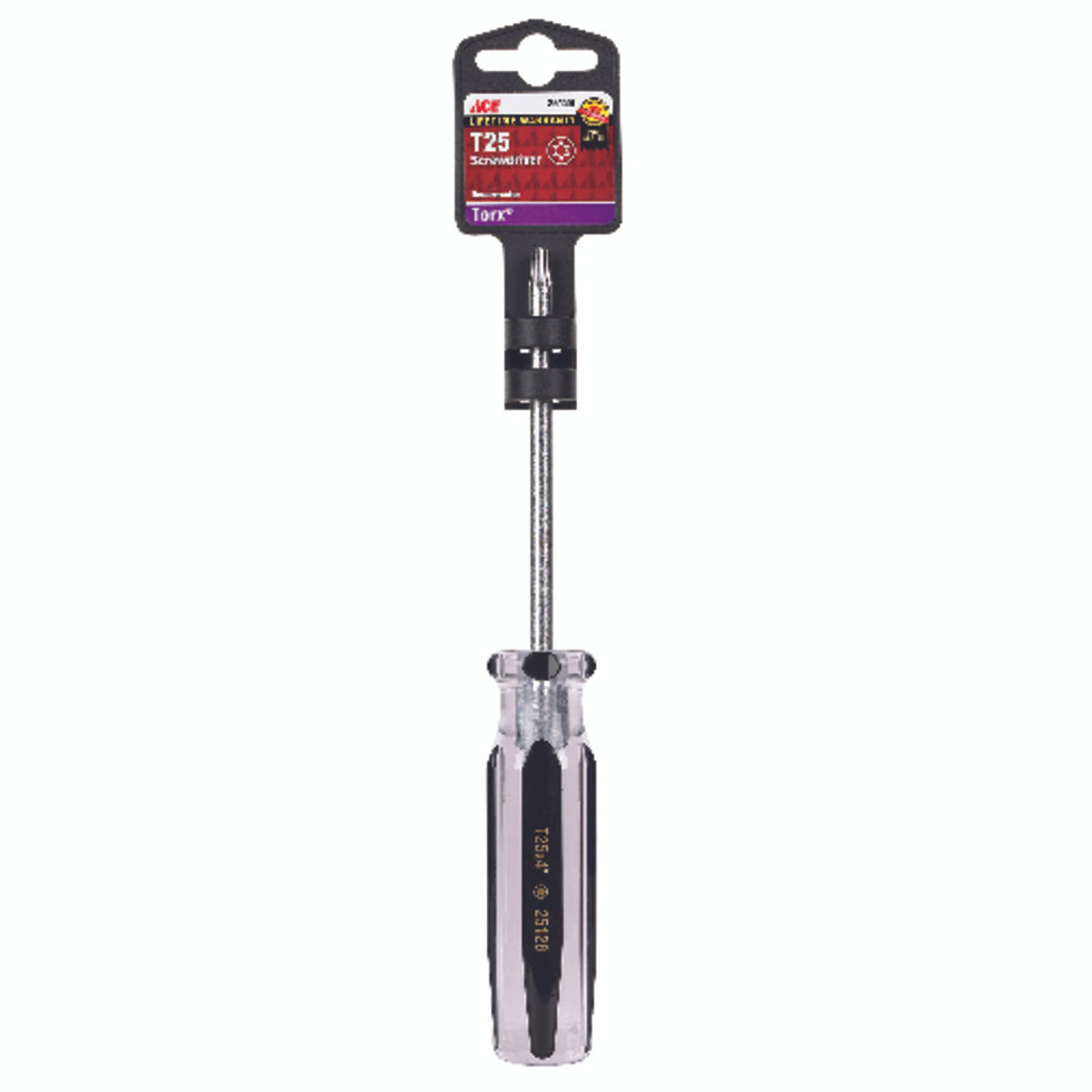 Brand Name: ACE | Color: BLACK | Drive Size: T25 | Drive Type: Torx | Handle Material: Plastic | Hardened: Yes | Number in Package: 1 pc. | Packaging Type: Clamshell | Ratcheting: No | Shaft Length: 4 in. | Shaft Material: Steel | Shaft Type: Round | Drive Type: Torx The clear, chemical-resistant handle provides a comfortable grip while allowing for just the right amount of torque. The easy-grip handle makes it simple to maintain hand-positioning for multiple turns. | The acetate handle is made to be chemical resistant for longer wear and designed to offer you a secure grip | SVcm steel optimizes toughness, hardness, and durability