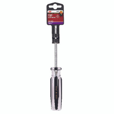 Brand Name: ACE | Color: BLACK | Drive Size: T27 | Drive Type: Torx | Handle Material: Plastic | Hardened: Yes | Magnetic Tip: No | Number in Package: 1 pc. | Overall Length: 8.07 in. | Packaging Type: Clamshell | Ratcheting: No | Shaft Length: 4 in. | Shaft Material: Steel | Shaft Type: Round | Drive Type: Torx The clear, chemical-resistant handle provides a comfortable grip while allowing for just the right amount of torque. The easy-grip handle makes it simple to maintain hand-positioning for multiple turns. | The acetate handle is made to be chemical resistant for longer wear and designed to offer you a secure grip | SVcm steel optimizes toughness, hardness, and durability | Blade features a chrome finish that offers protection against corrosion