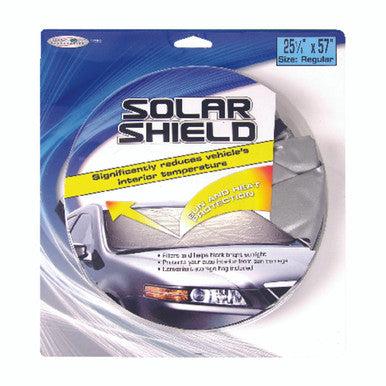Brand Name: Custom Accessories | Color: Silver | Foldable: Yes | Length: 25 in. | Material: Nylon | Width: 28 in. Solar shield sun protection from Custom Accessories keeps your vehicles interior cool and protected under the harshest conditions. Block heat and damaging UV rays while your car is parked in the sun. Sizes to fit most cars, trucks and SUVs. | Regular size 25 inch x 28 inch expands to fit compact to midsize vehicles | Nylon loop sunshade expands on the interior of your windshield to control interior temperatures | Interior temperatures in hot weather and sunny conditions | Reflective material for maximum heat and UV protection | Closure band and carry pouch included for easy storage