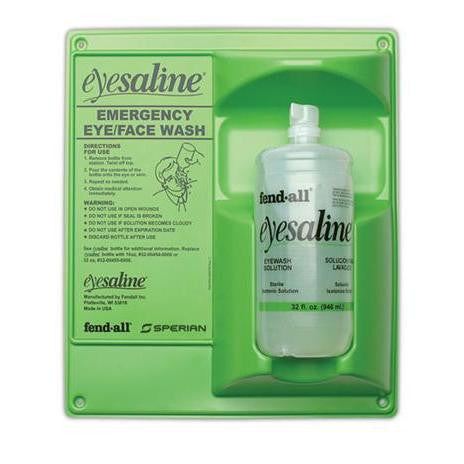 Wall mountable eye flush station with single 32 ounce bottle. One bottle of sterile isotonic buffered solution (net weight 32 fluid ounces) for flushing or irrigating the eyes on a wall mount ready station.