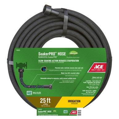 Brand Name: ACE | Burst Pressure: 200 psi | Color: BLACK | Crush Resistant: No | Diameter: 3/8 in. | Fitting Coupling Material: Brass | Grade: Medium-Duty | Kink Resistant: No | Length: 25 ft. | Material: Rubber | Reel Included: No | Safe for Drinking Water: Yes Featuring tiny holes or à ¢Ã¢â€š ¬Ã…“poresà ¢Ã¢â€š ¬ _x009d_ along its length, the SoakerPRO ® soaker hose weeps water directly to plantsà ¢Ã¢â€š ¬Ã¢â€ž ¢ root systems at a rate of 0.5 gallonà ¢Ã¢â€š ¬Ã¢â‚¬Å“1 gallon per foot per hour on ground level. This not only reduces evaporation, but also uses up to 70 percent less water than a conventional sprinkler. To further reduce water consumption, weà ¢Ã¢â€š ¬Ã¢â€ž ¢ve added a patented blue water restrictor in the female coupling to control water pressure and flow. The SoakerPRO ® soaker hose is very lightweight, which makes it easy to wind around plants and set under soil or mulch. Once established, you no longer have to carry or drag a cumbersome garden hose to water your garden. In addition, your delicate flowers, foliage and vegetables are protected from the intense water pressure that comes from a traditional water hose and/or nozzle. The SoakerPRO ® soaker hose is made from 65 percent recycled rubber and backed by a 7-year warranty. Ità ¢Ã¢â€š ¬Ã¢â€ž ¢s also lead-free and compliant with Californiaà ¢Ã¢â€š ¬Ã¢â€ž ¢s strict phthalate-content standards, so no harmful chemicals or odors are added to your water supply. | Soaker hose with pores that slowly release water directly to plantsà ¢Ã¢â€š ¬Ã¢â€ž ¢ roots, reducing evaporation for more efficient watering | Made in the USA with global components | Ideal for flowerbeds, gardens and large landscaping projects | Weeps water at a rate of 0.5 gallonà ¢Ã¢â€š ¬Ã¢â‚¬Å“1 gallon per foot per hour on ground level | Patented blue water restrictor in female coupling controls water pressure/flow, reducing water consumption | Made of 65% recycled rubber and uses up to 70% less water than a conventional sprinkler | Lightweight, easy to wind around plants and set under soil or mulch | Protects delicate flowers, foliage and vegetables from direct contact with damaging water pressure | Meets lead-free standards under Federal Safe Drinking Water Act | 7-year warranty