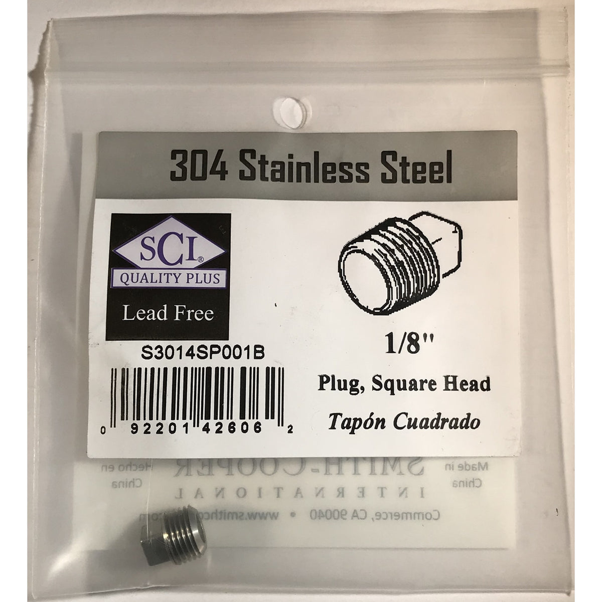 Average Lead Content: Lead Free | Brand Name: Smith Cooper | End 1 Diameter: 1/8 in. | End 1 Type: MPT | Material: Stainless Steel | Packaging Type: Carded SCI Stainless Steel Fittings & Nippples are a cost effective replacement for brass. They offer more Corrosion, Heat, and Pressure resistance than Brass and have always been Lead Free. Stainless Steel doesn't cause electrolysis so you can use it with any other metal. Marine, Automotive, Agricultural, Irrigation, and Plumbing... the better choice is SCI Stainless Steel. | National Pipe Thread, ASME B1.20.1 | Exceeds brass in corosion resistance | No Electrolysis with other metals