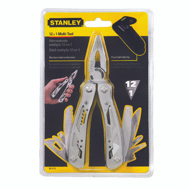 What's Included: Long Nose Pliers, Curve jaw Pliers, Wire Cutter, Saw, Phillips ® Screwdriver, Standard Screwdrivers (1/4 in., 5/16 in., 1/8 in.), Small knife, Large knife, Bottle Opener | Brand Name: Stanley | Color: Gray | Material: Stainless Steel | Number in Package: 1 pc. | Number of Tools: 12 tool | Packaging Type: Carded | Style: Folding The Stanley 12 in 1 multi-tool has stainless-steel construction with a high quality nylon holster. Includes long nose pliers, curve jaw pliers, wire cutter, saw, phillips screwdriver, standard screwdrivers (1/4 in., 5/16 in., 1/8 in.), small knife, large knife and bottle opener. Great gift. | What's Included: Long Nose Pliers, Curve jaw Pliers, Wire Cutter, Saw, Phillips ® Screwdriver, Standard Screwdrivers (1/4 in., 5/16 in., 1/8 in.), Small knife, Large knife, Bottle Opener | Convenient for any situation requiring tools | Hardened and tempered tool for long life | Unique design, compact, portable and practical mini pliers