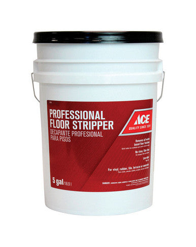 Brand Name: ace | Compatible Floor Type: vinyl;vinyl | Container Size: 5-gal. | Package Size: 5-gal. | Packaging Type: pail | Product Form: liquid Ace Professional Floor Stripper is extremely powerful and easily removes most waxes, floor finishes, and sealers. It does not contain ammonia and does not leave an alkaline residue. | Low odor, non-ammonia formula | Formulated to quickly penetrate and dissolve multiple layers of floor finish | Removes all water-based waxes, acrylic finishes, sealers and urethanes | Leaves no free alkali residue | Labor saving. Just mop down, scrub, pick-up and recoat. No rinsing is required since it leaves no alkaline residue | 5 Gallon