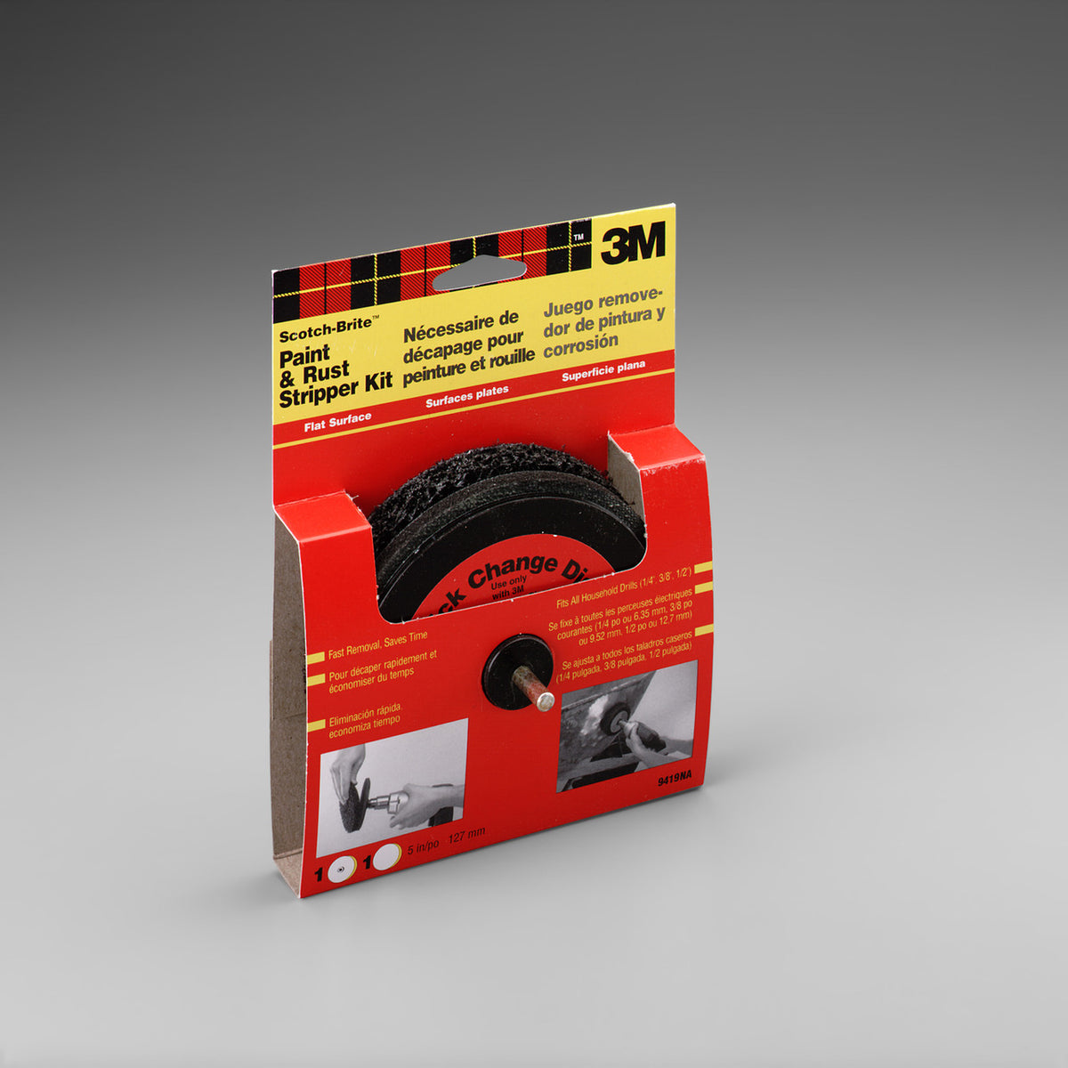 Brand Name: 3M | Diameter: 5 in. | Number in Package: 1 pk | Packaging Type: Carded | Sub Brand: Scotch-Brite Scotch-Brite flat surface paint and rust stripper kit is ideal to use on flat projects requiring fast removal of surface paint and rust from wood, metal and plastic. Hook and loop disc mounts to back-up pad. | Effective in water based paints | Hook and loop quick change disc pad | For electric drills