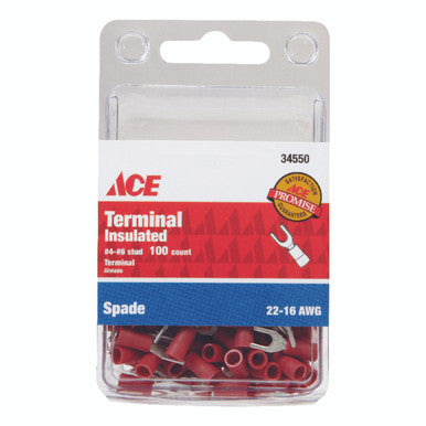 Brand Name: ACE | CSA LIsted: Yes | Color: Red | Number in Package: 100 pk | Packaging Type: Carded | UL Listed: Yes | Wire Range: 22-18 AWG | Wire type: Insulated Wire Terminal Insulated | Spade | 22-16 AWG | #4-#6 Stud | 100 Ct.